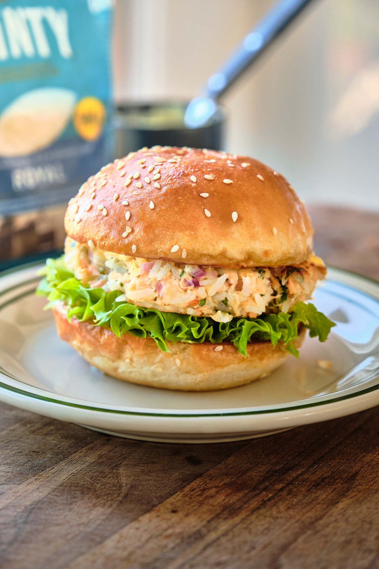 Une version estivale du hamburger traditionnel. Délicieux avec de la salade verte et de la patate douce!