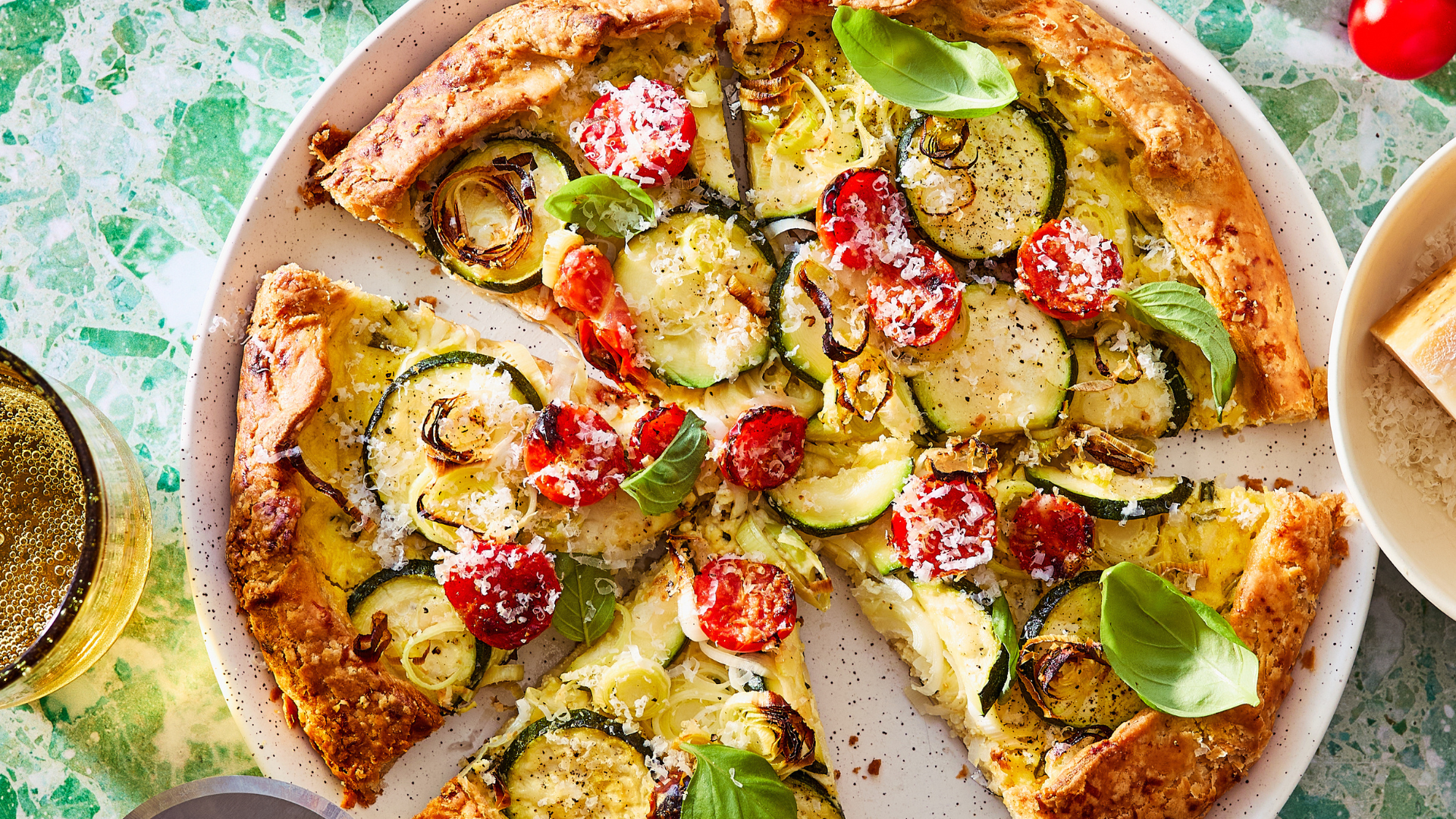 Abaissez votre pâte jusqu’à obtenir un cercle d’environ 12 pouces (ou dépliez en forme de grand rectangle) et placez-la sur la plaque du four. Étalez le mélange de ricotta au centre de la pâte, en laissant un bord d’environ 2″ tout autour. Disposez les tranches de courgettes et de poireaux sur le dessus de la ricotta. Répartissez les tomates cerises et le reste du fromage de chèvre sur le dessus. Repliez les bords de la pâte vers l’intérieur et vers le centre.