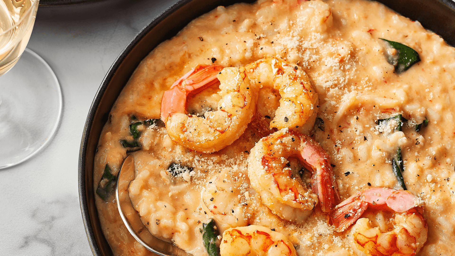 Finition : Ajouter les crevettes et le homard 5 minutes avant la fin. Hors du feu, incorporer la crème, le parmesan et le reste de beurre. Rectifier l’assaisonnement.