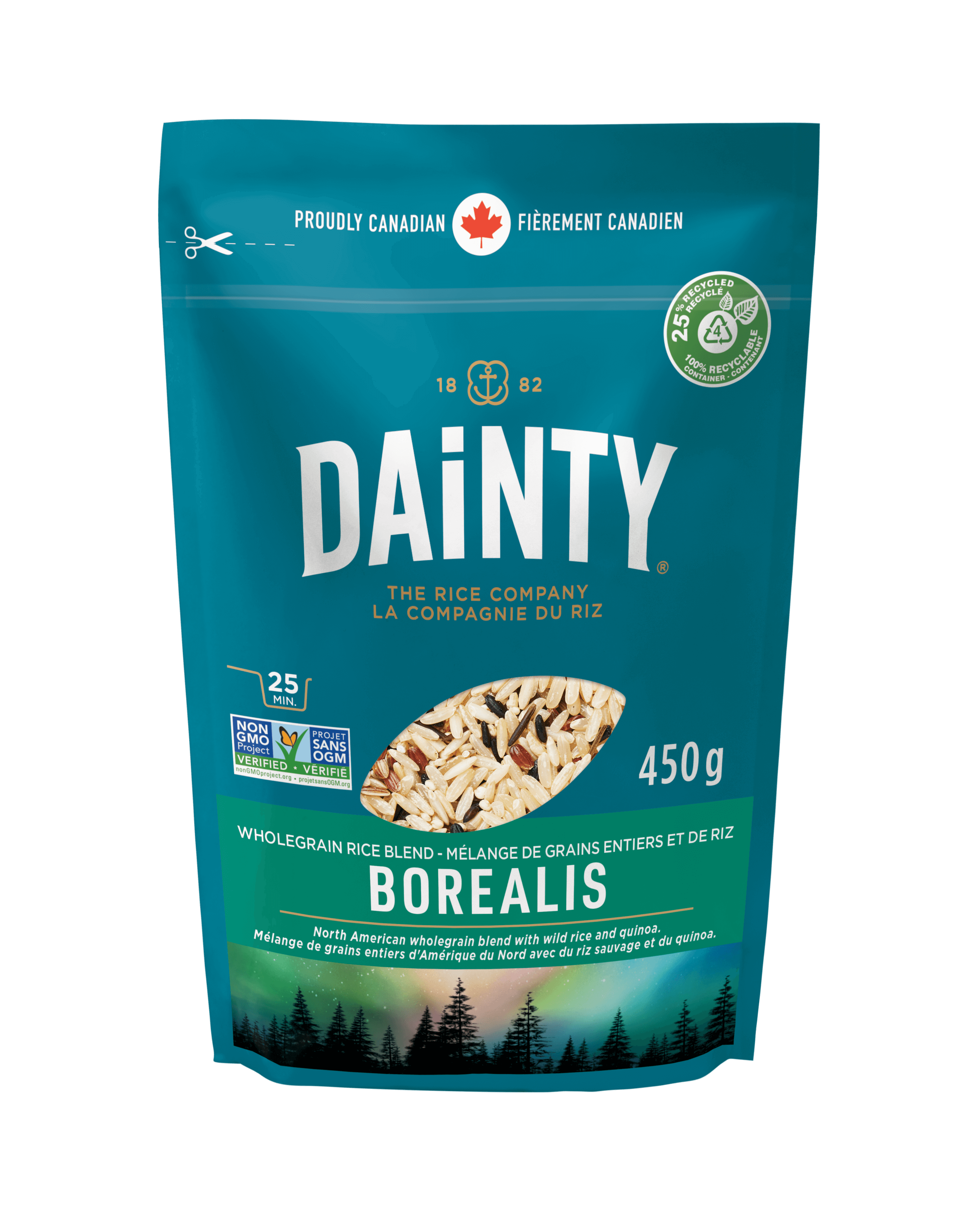 Dans un plat à gratin, ajouter le mélange de riz Dainty Borealis et le bouillon de bœuf. Répartir le reste du beurre sur le dessus. Couvrir de papier d’aluminium et mettre au four. Faites cuire pendant 25 minutes.