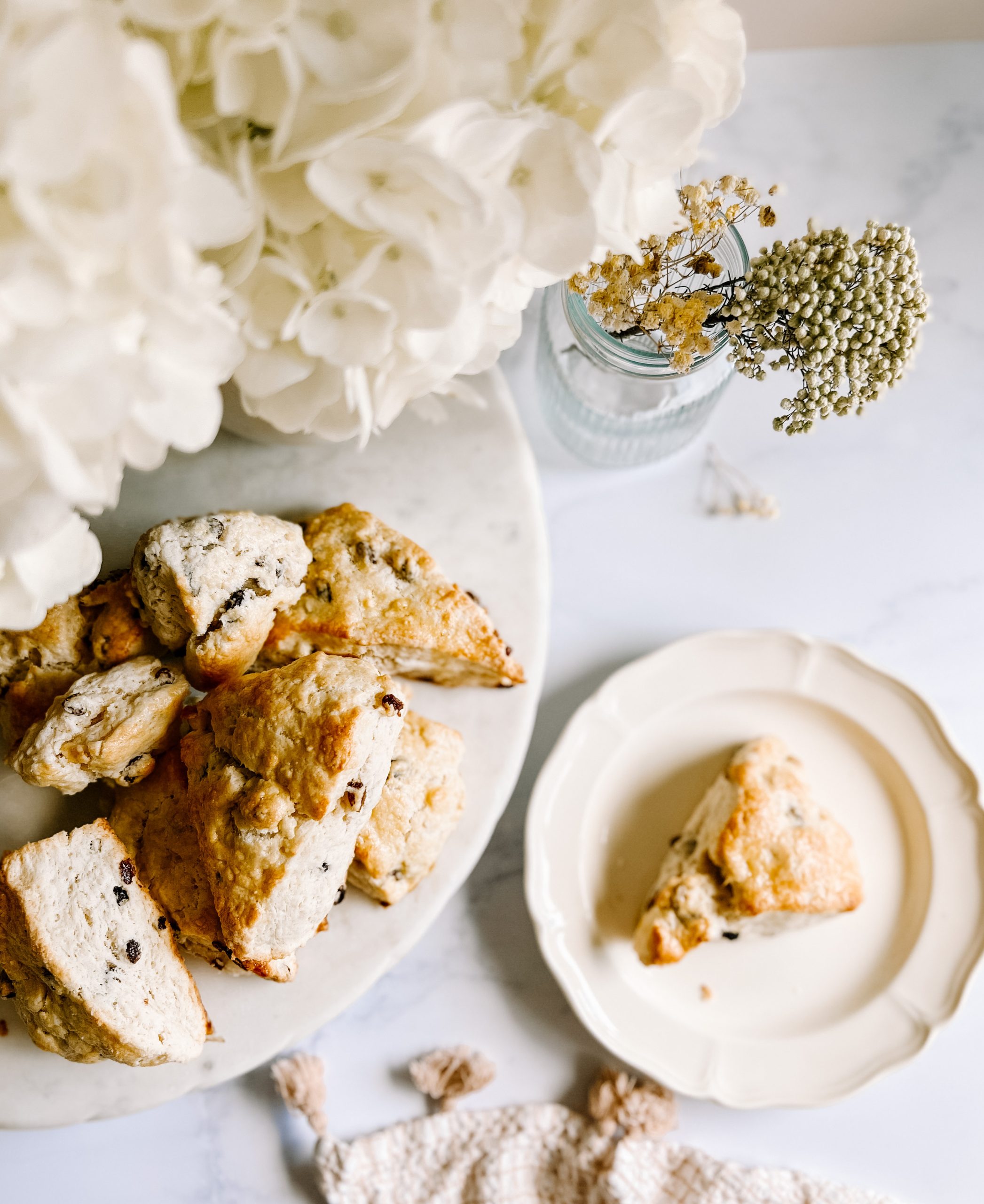 Incorporer les raisins secs ou les raisins de Corinthe et verser la crème. À l’aide d’une spatule, remuez jusqu’à ce que le mélange commence à se former. Avec vos mains, pressez les morceaux restants pour former une grande masse. Placez-la sur un plan de travail propre et formez un cercle, tout en la pressant pour obtenir une épaisseur d’environ ¾ de pouce. À l’aide d’un couteau bien aiguisé, coupez le cercle en 8 pointes égales.