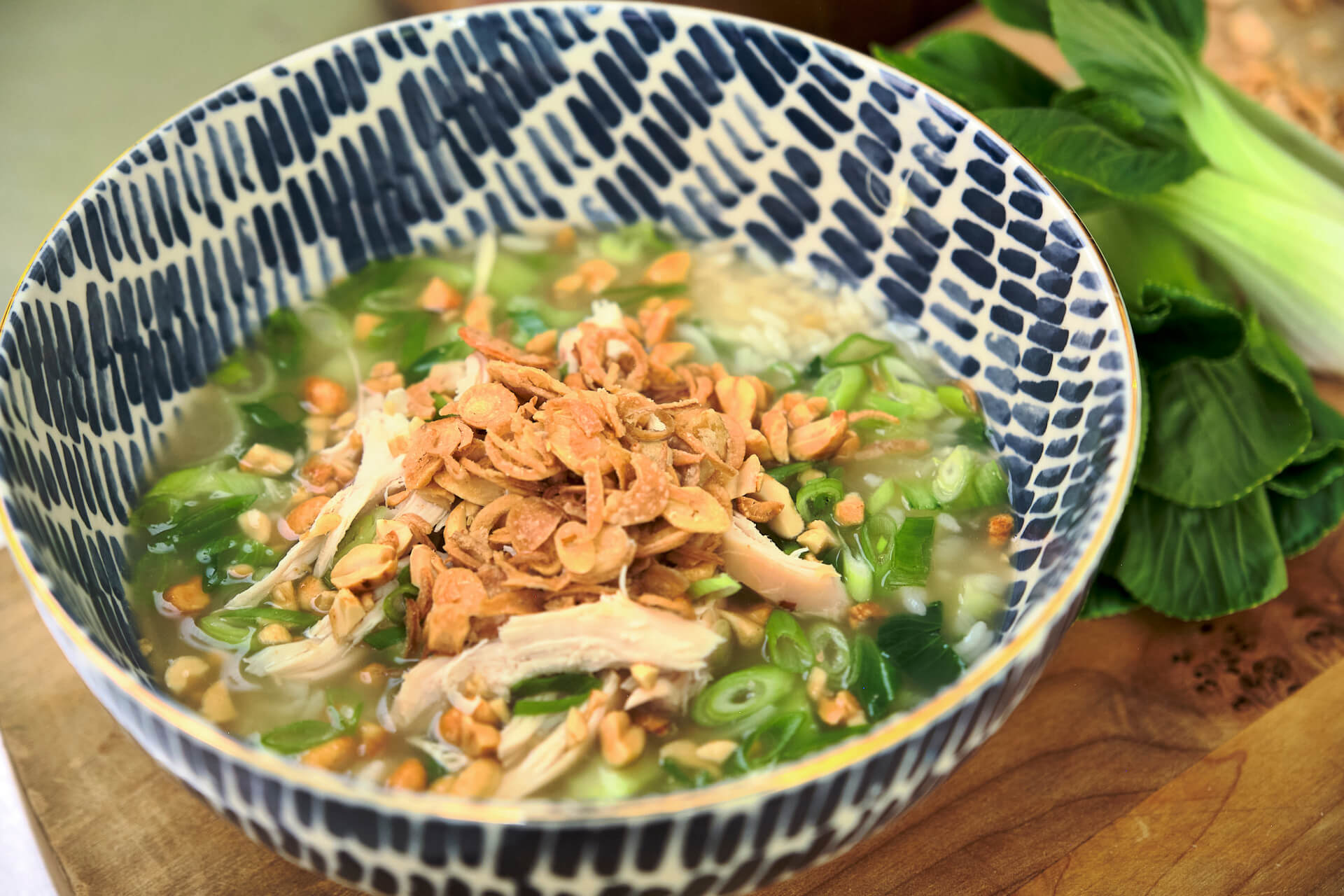 Pour servir, versez dans un grand bol à soupe et garnissez d’oignons verts émincés, de cacahuètes grillées et d’oignons frits pour chaque personne.