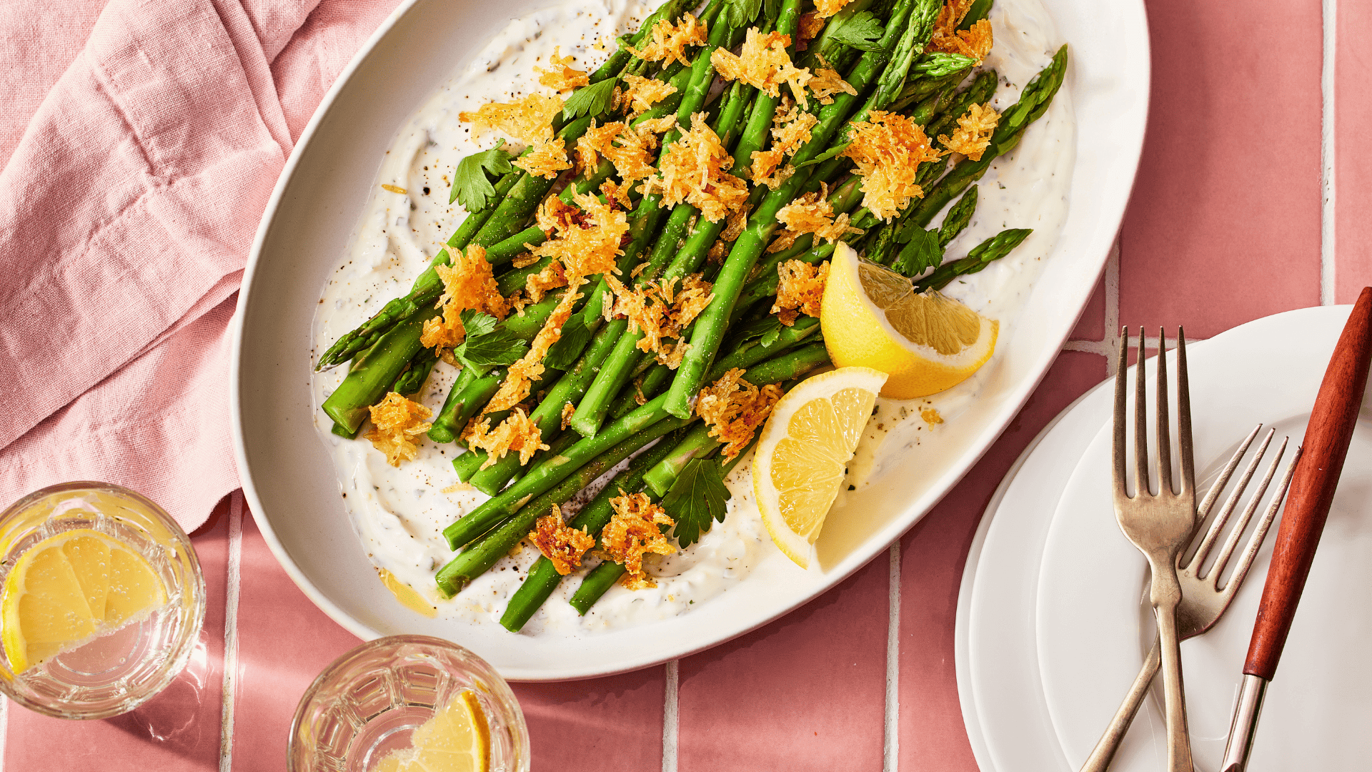 To serve, spread the yogurt on the base of a large serving plate. Place the asparagus on top and crumble the crispy rice over.