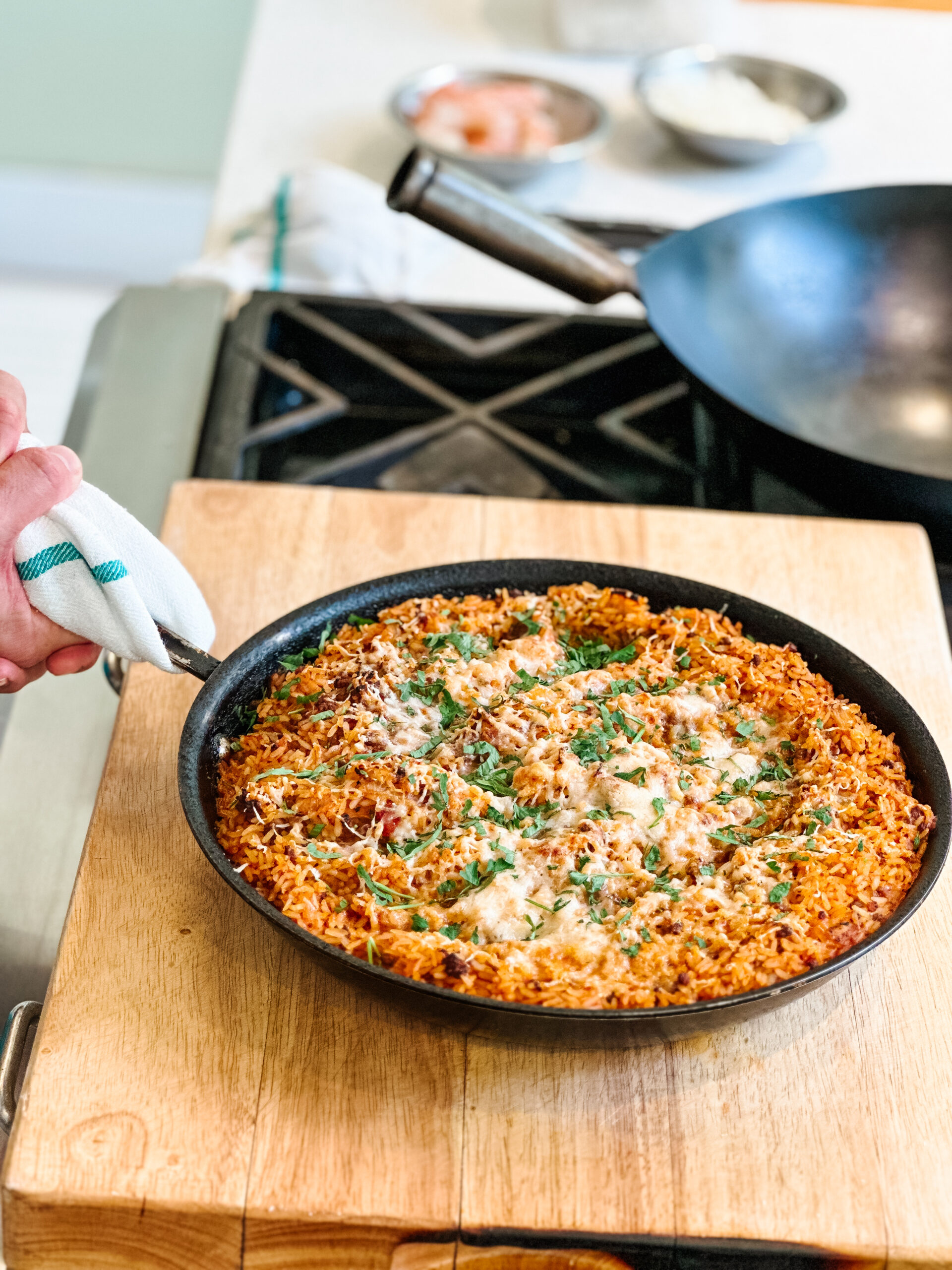 Add your 3/4 cooked rice to your large frying pan with the meat and tomato mixture and stir to combine. Sprinkle with parmesan and breadcrumbs and bake for 20 minutes. Remove form the oven and serve!