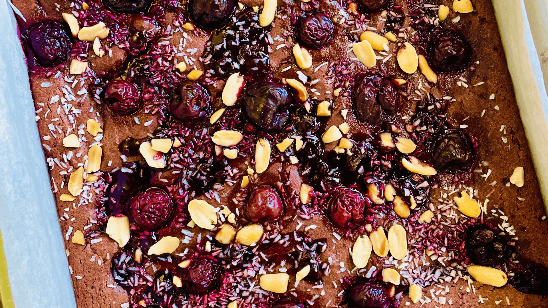 Dot the cherries over top and sprinkle the coconut and peanuts evenly. Place in the oven to bake.Â