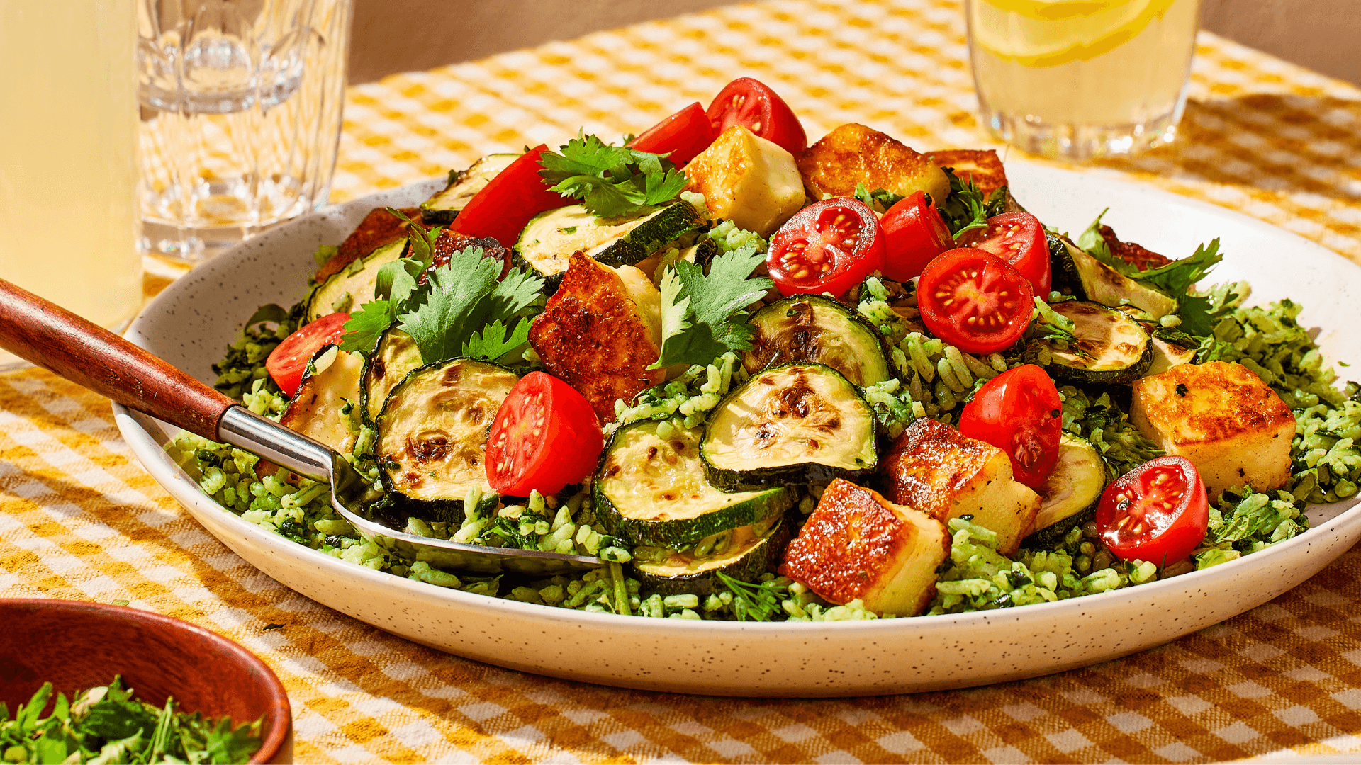 To serve, spoon some of the green rice onto a bowl. Top with some of the grilled zucchini, halloumi, cherry tomatoes, and a sprinkling of the herbs.