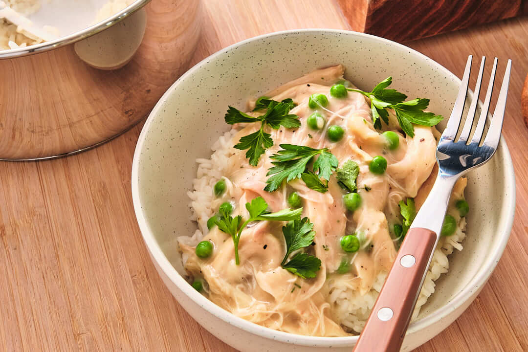 To finish the gravy, stir in the shredded turkey meat and peas. Heat through.