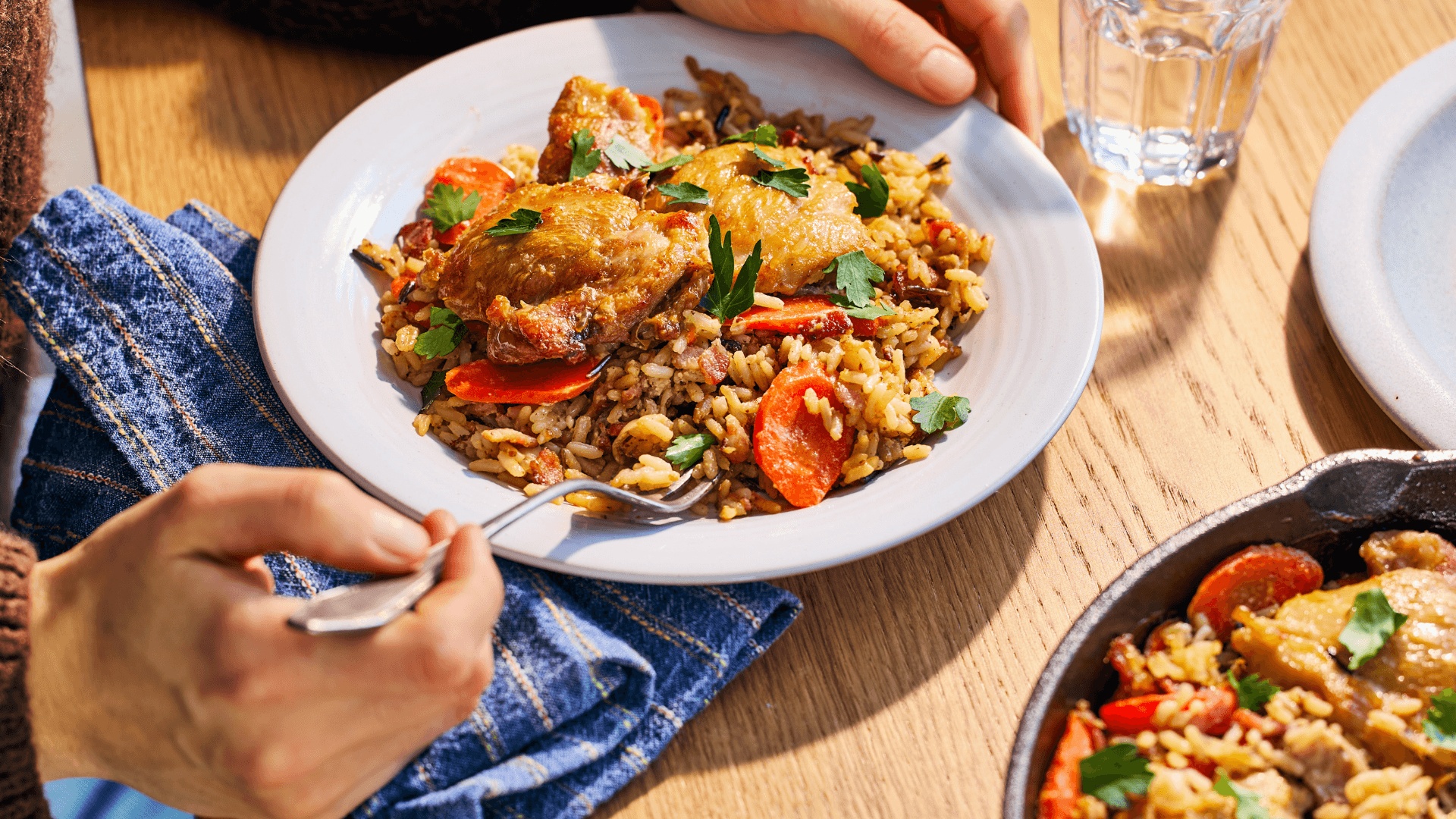 Nestle the chicken back into the rice with the skin side up. Bring to a gentle simmer then transfer the pan to the oven. Allow to cook for 25 minutes, or until the rice has absorbed the liquid fully and the top is a little crispy.