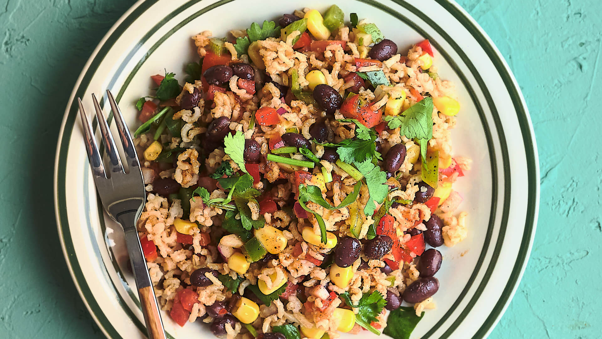 Combine the remaining ingredients in a large bow, add the cooled rice and toss to combine. Drizzle the dressing over the salad, taste and adjust seasoning with salt and pepper. Serve!