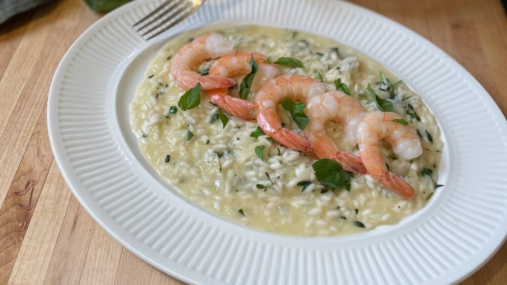 When the rice is cooked, remove from the heat and stir in the remaining butter and parmesan cheese and adjust the seasoning with salt and pepper. Finally, stir in the all the herbs and serve immediately. If using big shrimp, placed them on top for presentation.Â